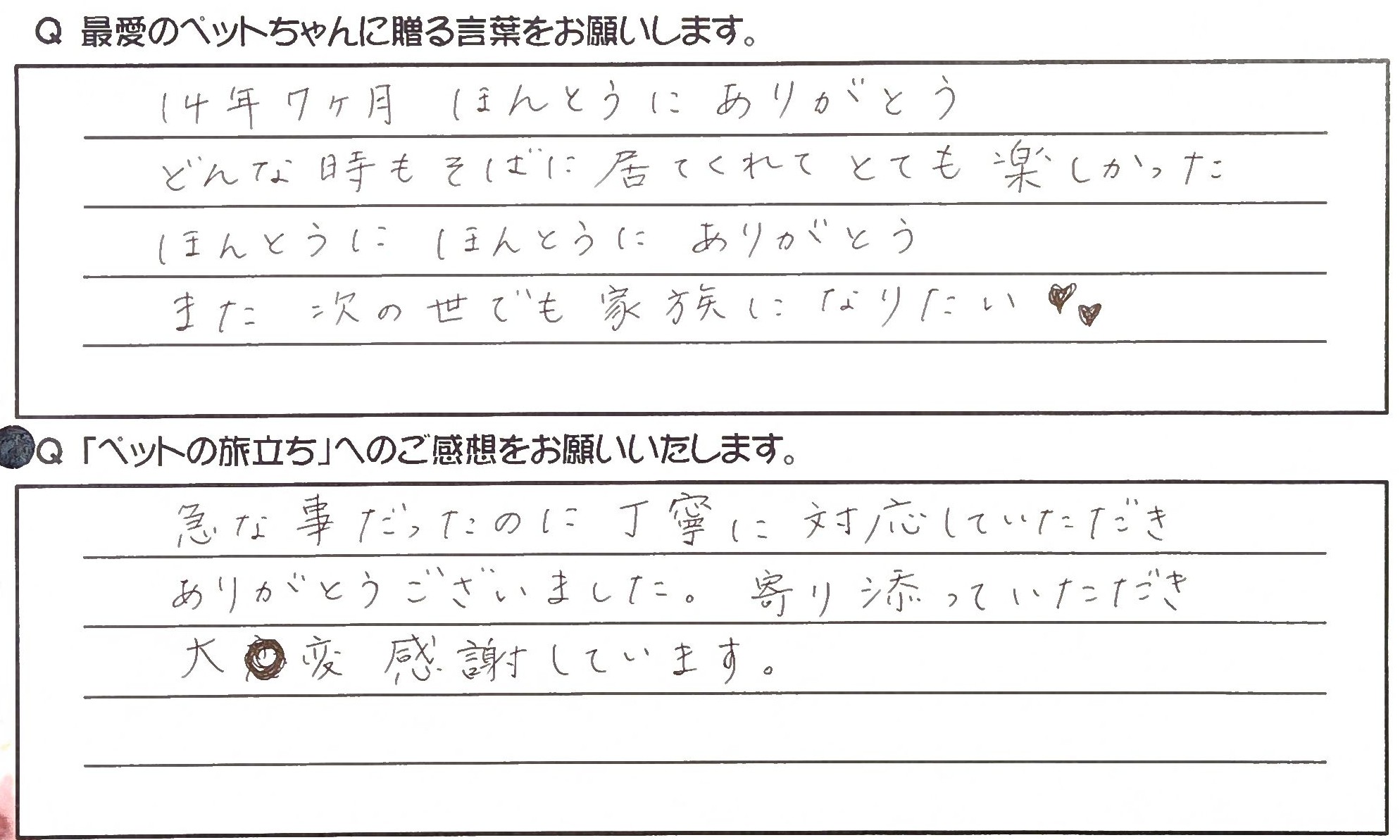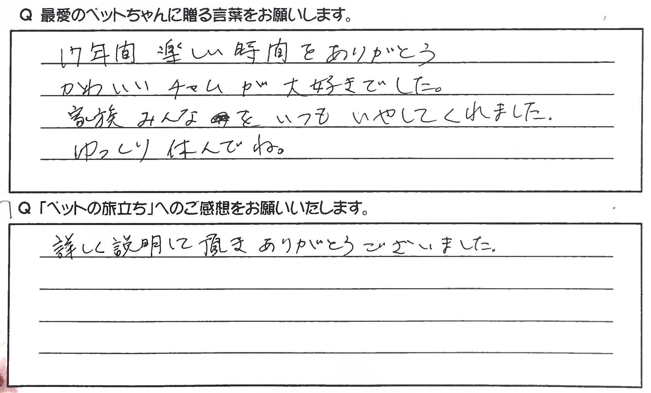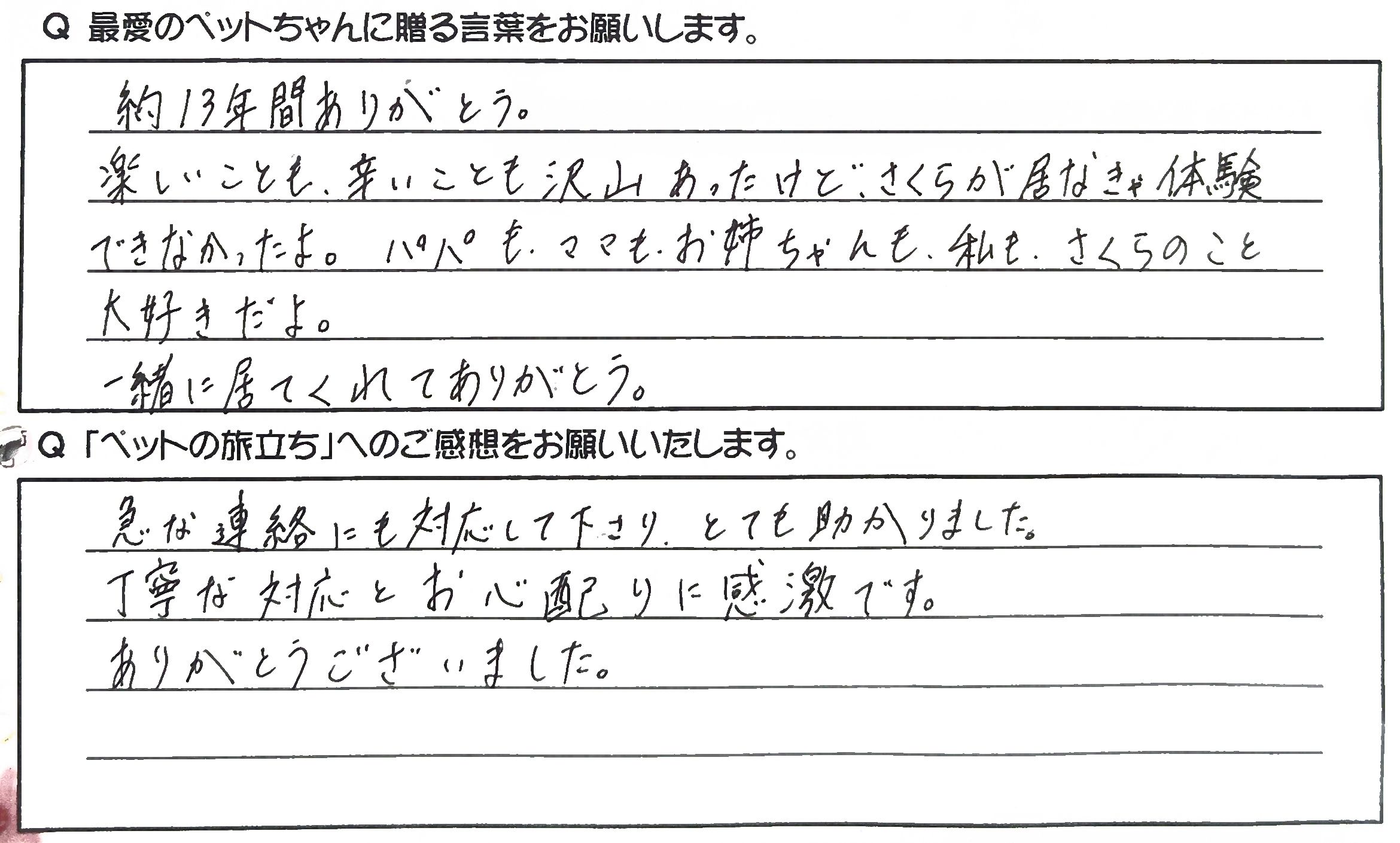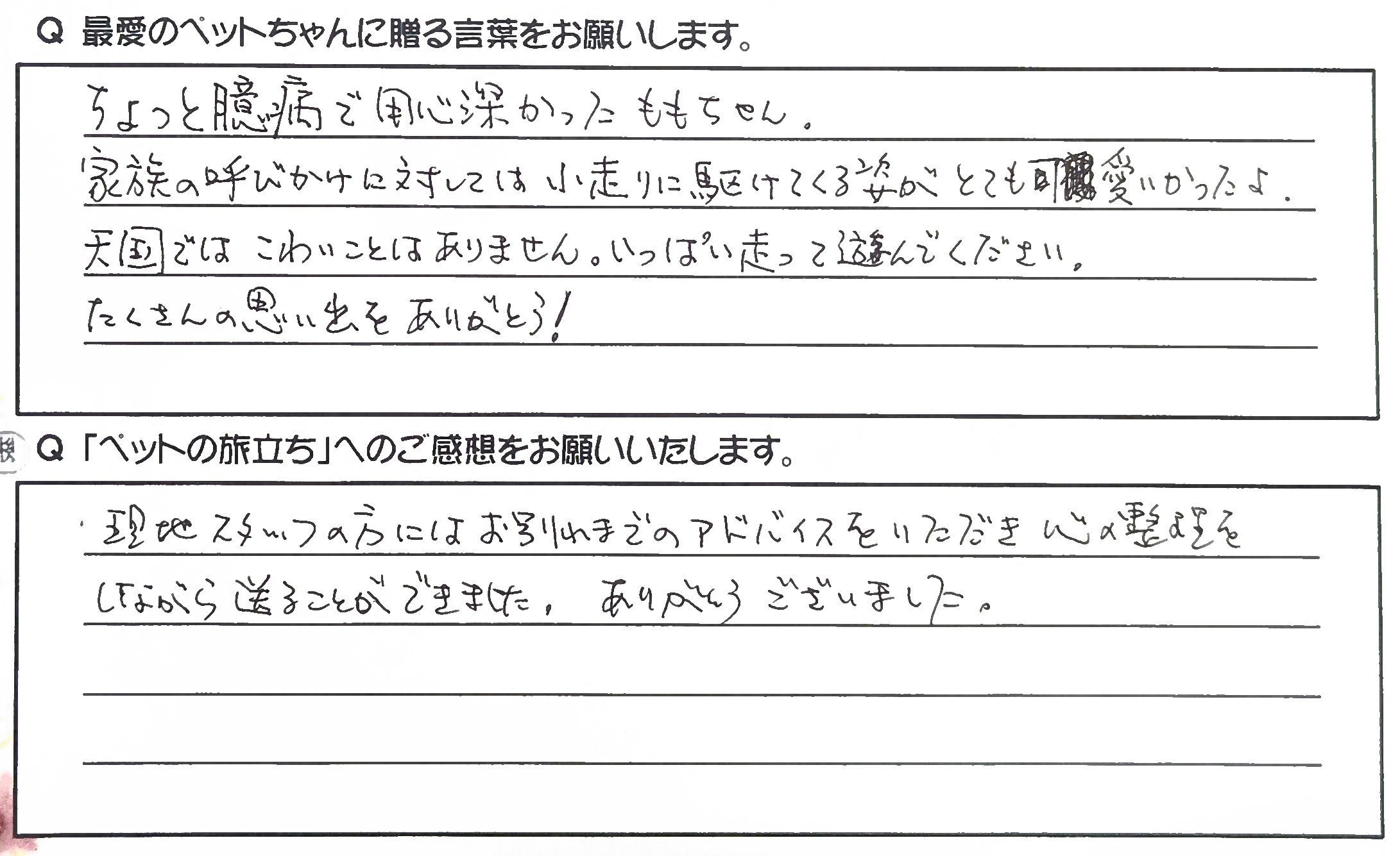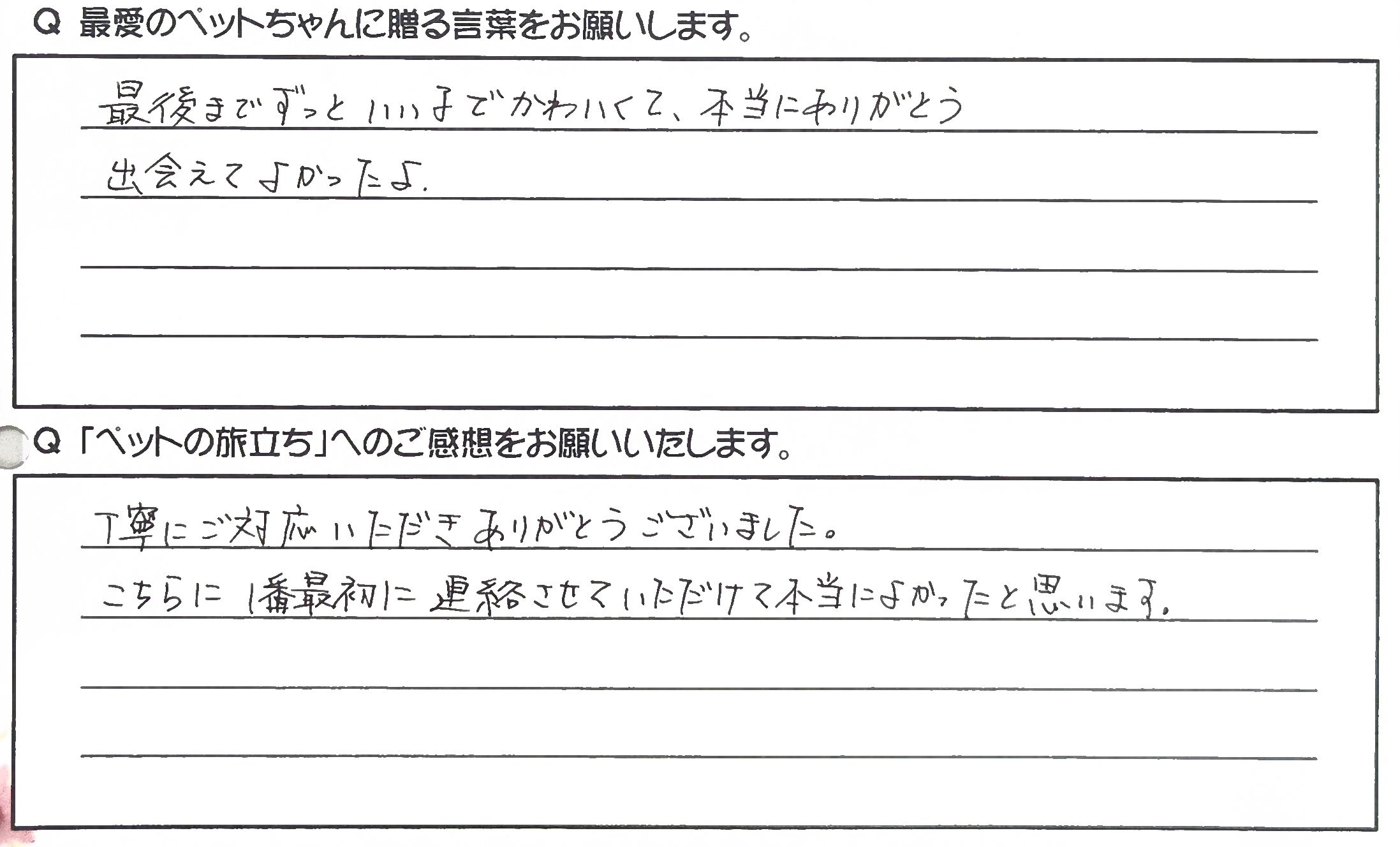 現地スタッフの方にはお別れまでのアドバイスをいただき心の整理をしながら送ることができました。 ありがとうございました。