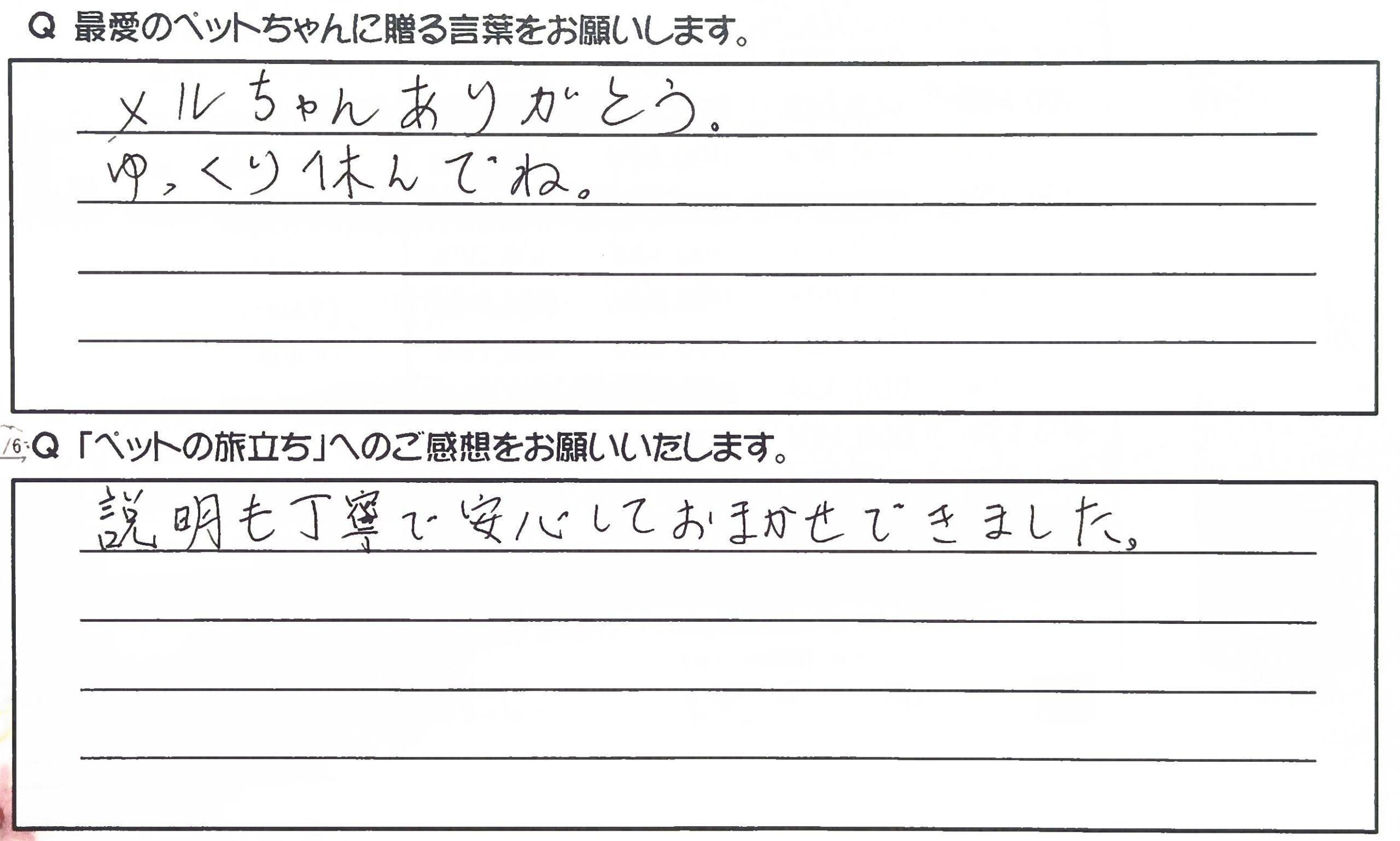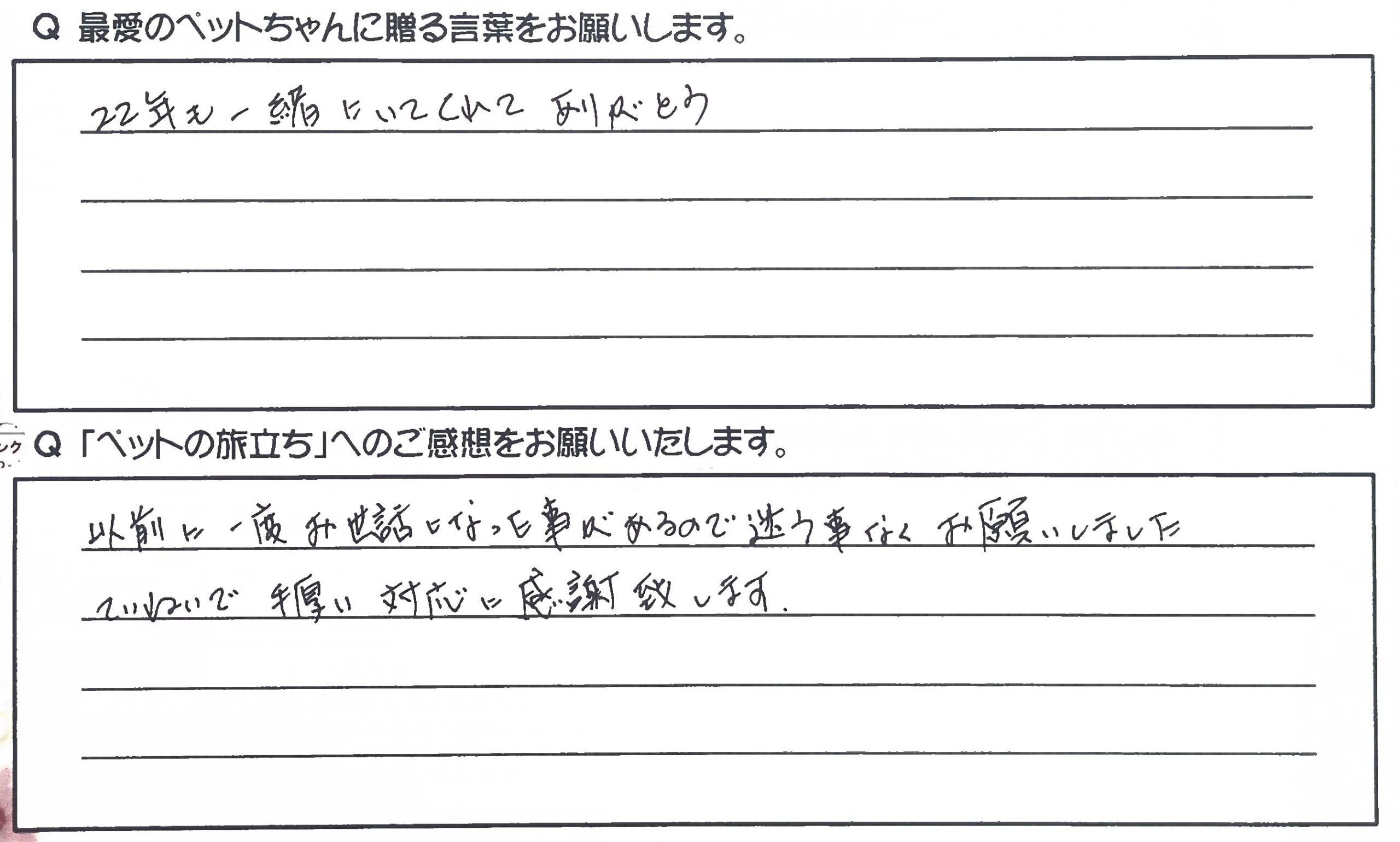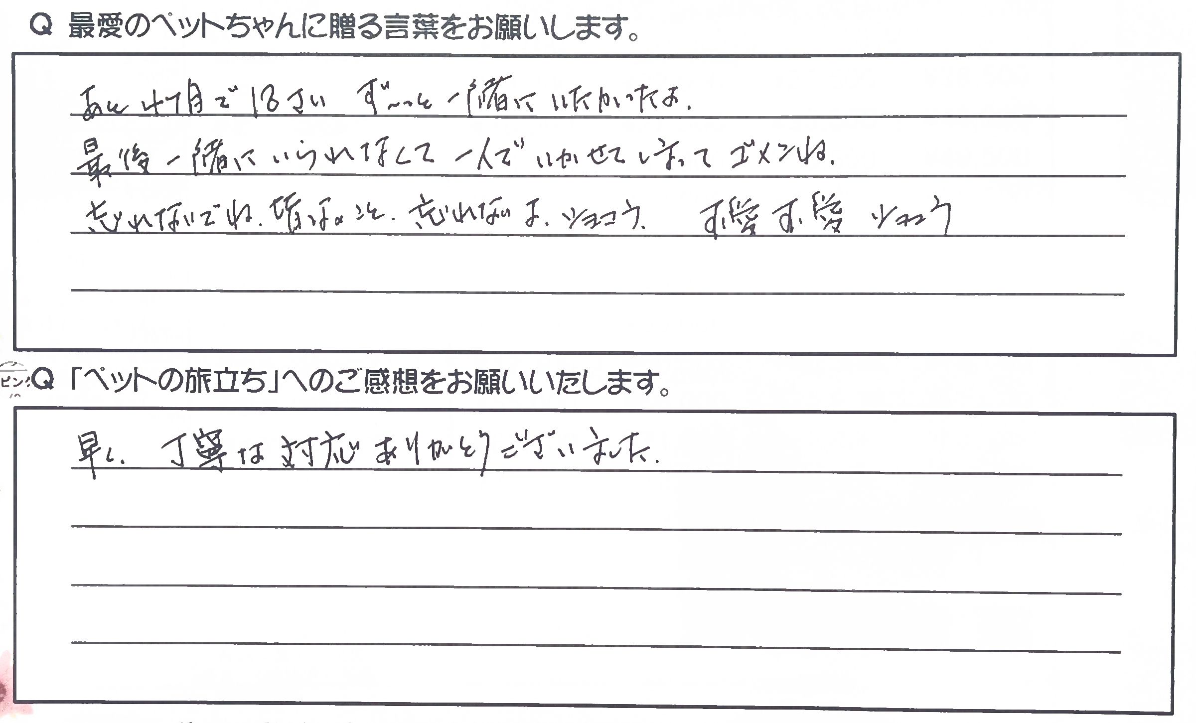 親切に教えて頂いたりアドバイス、対応など良かったです。 気持ちを理解して下さり、また、うちの猫をなでて最後かいわがって下さりありがとうございました。 転生の話しや葬儀のお話し、とても分かりやすく説明して下さりありがたかったです。 急なプラン変更にもこころよく受け入れて下さり、頼んでよかったと思いました。