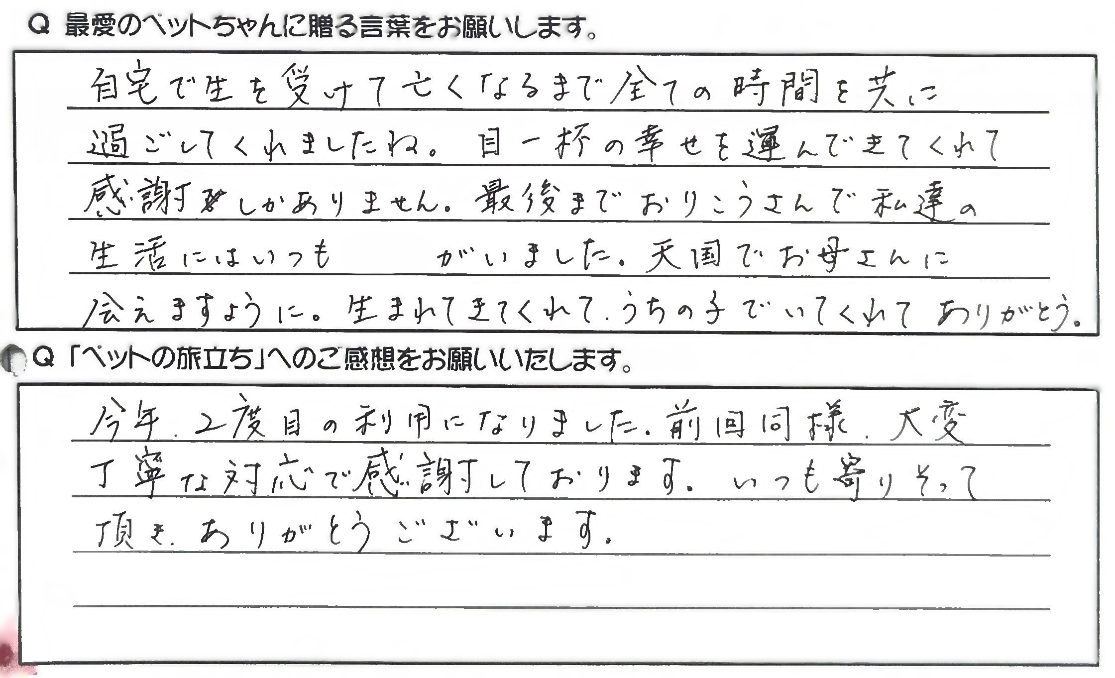 今年2度目の利用になりました。 前回同様、大変丁寧な対応で感謝しております。 いつも寄りそって頂きありがとうございます。