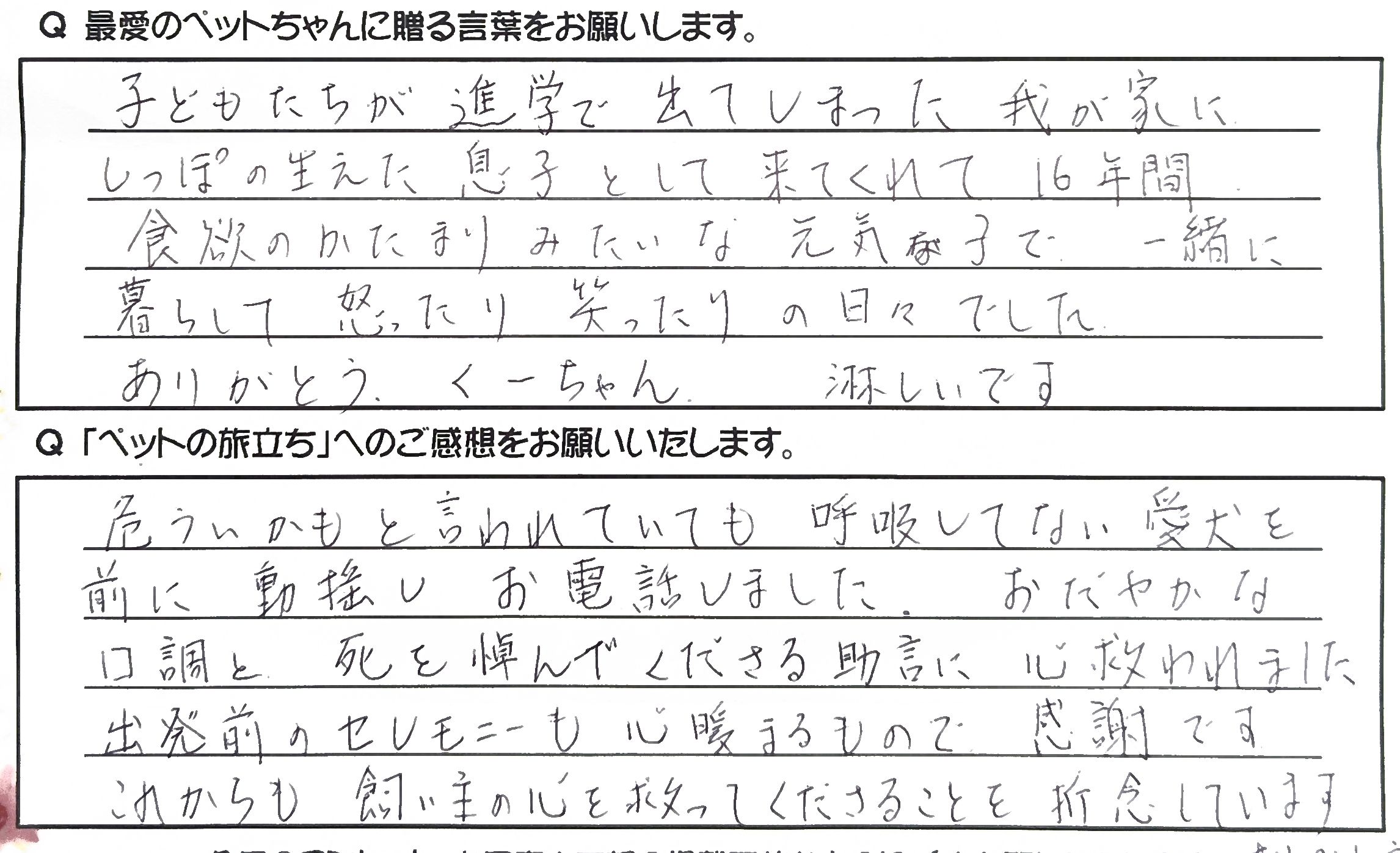 危ういかもと言われていても、呼吸してない愛犬を前に動揺しお電話しました。 おだやかな口調と、死を悼んでくださる助言に心救われました。 出発前のセレモニーも心暖まるもので感謝です。 これからも飼い主の心を救ってくださることを祈念しています。 ありがとうございました。